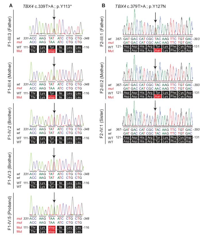 Figure S1: Segregation analysis of causative germline TBX4 mutations. Sanger sequencing of TBX4 mutations in available family members of Family 1 (a) and Family 2 (b). wt: wildtype, mut: mutant.