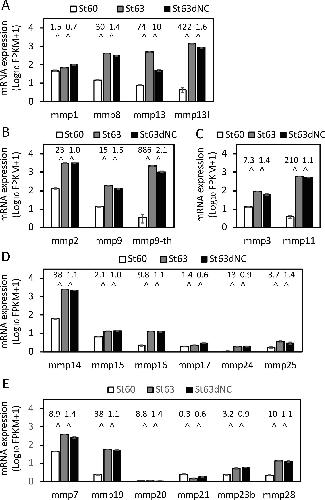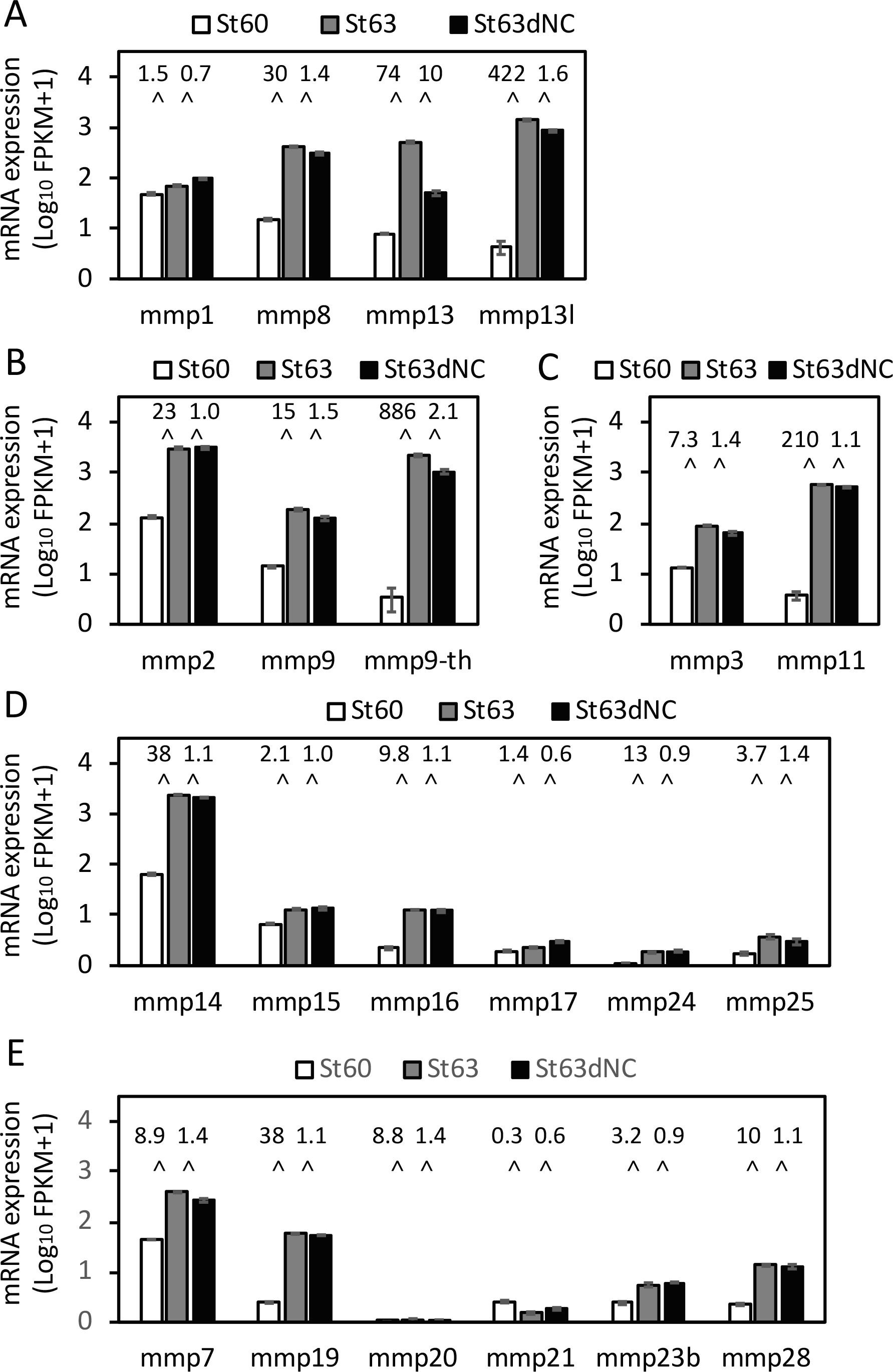 Fig. 2. The expression profiles of matrix metalloproteinases (MMPs). The expression levels of collagenases (A), gelatinases (B), stromelysins (C), membrane-type MMPs (D), and other MMPs (E) in stage-60-tail (St60), stage-63-tail (St63) and stage-63-notochord-removed-tail (St63dNC) were obtained from RNA-Seq data by using ENSEMBL database except for mmp7. The data for mmp7 was obtained from the same RNA-Seq data by using NCBI database because there is no accession number for mmp7 in ENSEMBL. The fold differences between St63 and St60 or St63dNC were indicated in figures. Samples were same as Fig. 1. Data were mean ± SD of three technical replications.
