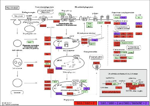 Fig. 5. The up-regulated genes in the phagosome pathway. The metamorphosis-induced genes were showed in red and the genes induced specifically in notochord during metamorphosis were showed in purple. There were no genes which were expressed at 2 fold or higher level in the whole tail compared to the notochord-removed tail at stage 63 but not upregulated between stage 60 and 63, i.e., all notochord-enriched genes in this pathway were upregulated during metamorphosis. The genes whose expression was not changed were shown in light green.