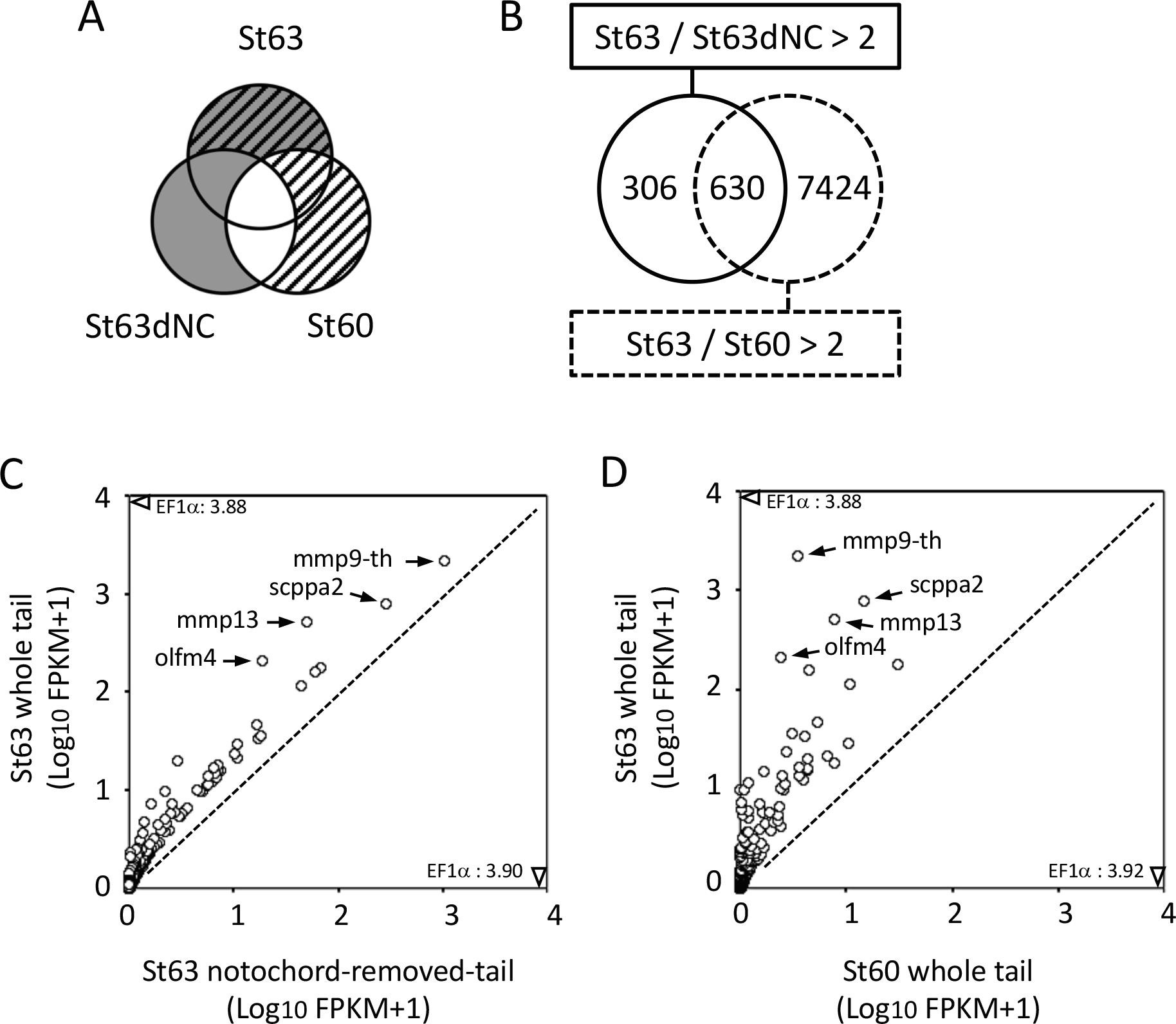 Fig. 1. Identification of notochord-enriched, metamorphosis-induced genes (A) The Venn diagram representation of the RNA-Seq analyses. The mRNAs from stage-60-tail (St60), stage-63-tail (St63) and stage-63-notochord-removed-tail (St63dNC, i.e., the remaining tail after removing the notochord) are sequenced by RNA-Seq and compared among each other. The lined areas represent the expression of notochord-enriched genes. The shaded areas represent the expression of metamorphosis-induced genes. The lined and shaded area represents that of notochord-enriched, metamorphosis-induced genes. (B) The Venn diagram showing the result of the comparisons between St63 and St63dNC (solid line) and between St63 and St60 (dashed line) RNA-Seq data. Each sample was prepared from the mixture of 5 (St60), 5 (St63) and 8 (St63dNC) tails, respectively. The numbers of genes with a more than two-fold increase in St63, were indicated. (C, D) Expression profiles of the 630 notochord-enriched, metamorphosis-induced genes. Each gene is represented by a circle in the graph, as determined by the relative expression levels in the St63 (vertical axis) and St60 (C) or St63dNC (D). The names of the most highly expressed four genes in St63 (arrows) and expression levels of elongation factor 1 alpha 1 (EF1α; [ENSXETG00000001182], white arrowhead) are also showed in figure. The dashed line indicates equal expression level between two samples. mmp9-th; matrix metalloproteinase 9-th [ENSXETG00000033145], scppa2; secretory calcium-binding phosphoprotein acidic 2 [ENSXETG00000000337], mmp13; matrix metalloproteinase 13 [ENSXETG00000022190], olfm4; olfactomedin 4 [ENSXETG00000018715]. Data were the average of three technical replications. FPKM: fragments per kilobase of exon per million reads mapped.