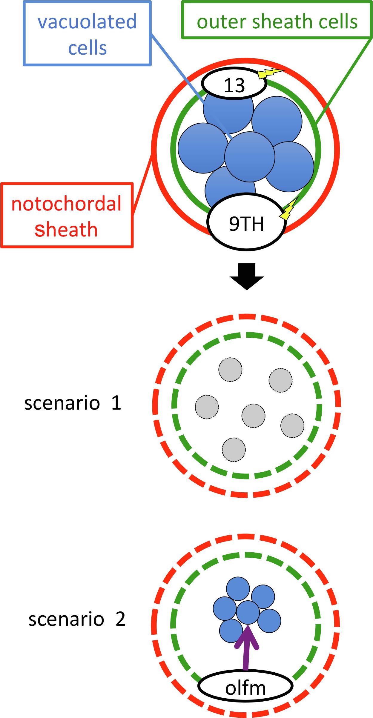 Fig. 6. Two potential models for notochord regression. MMP13 (13) expressed by outer sheath cells (solid green line) digests the notochordal sheath (solid red line). MMP9-TH (9TH) expressed by outer sheath cells digest the peri-notochordal basement membrane, thereby leading to the detachment of outer sheath cells from notochordal sheath, which in turn causes their apoptosis (dashed green lines). The ECM digestions by MMPs are indicated as yellow marks. Subsequently, two possible scenarios may occur. Scenario 1: The inner vacuolated cells are induced to undergo apoptosis (dashed gray circles) due to the loss of outer sheath cells. The notochord regression is mainly driven by the apoptosis of inner vacuolated cells. Scenario 2: Expression of olfm4 (olfm) as an extracellular matrix glycoprotein by the outer sheath cells facilitates the cell adhesion among inner vacuolated cells (purple arrow). The major driving force of notochord regression is the shrinkage of inner vacuolated cells.