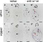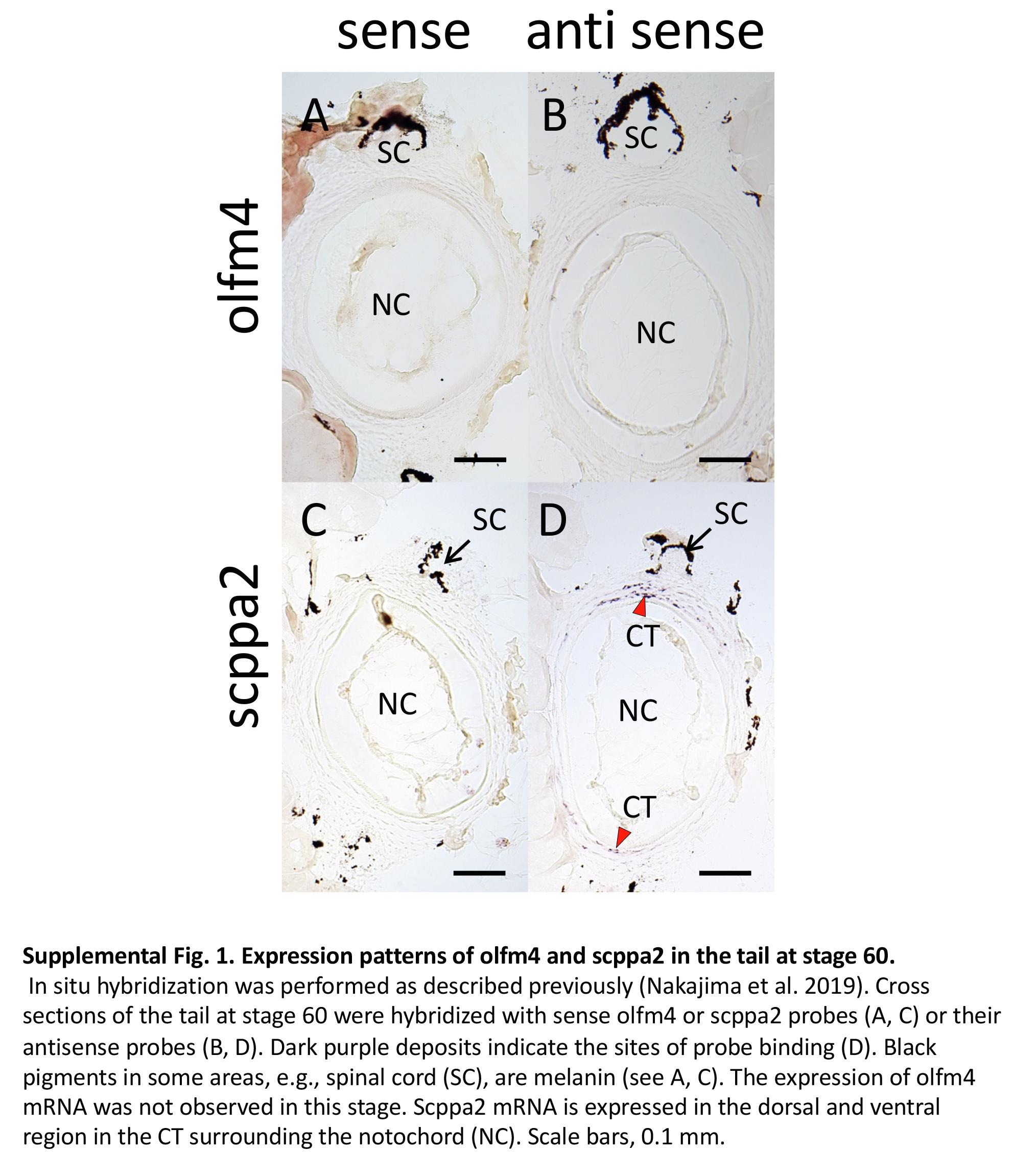 Fig. 4. Distinct localizations of olfm4 and scppa2 expression in the tail at the climax of metamorphosis. Cross sections of the tail at stage 62 were hybridized with sense olfm4 or scppa2 probes (A, Aâ, C, Câ) or their antisense probes (B, Bâ, D, Dâ). Dark purple deposits indicate the sites of probe binding. Black pigments in some areas, e.g., spinal cord (SC), are melanin (see A, Aâ, C, Câ). Note that olfm4 mRNA is expressed in the outer sheath cells (OS), but not in the connective tissue sheath (CT). Scppa2 mRNA is expressed in the OS and in the CT surrounding the notochord (NC). These same expression patterns were observed in three individual animals (not shown). Scale bars, 0.5 mm in A-D, 0.1 mm in Aâ-Dâ.