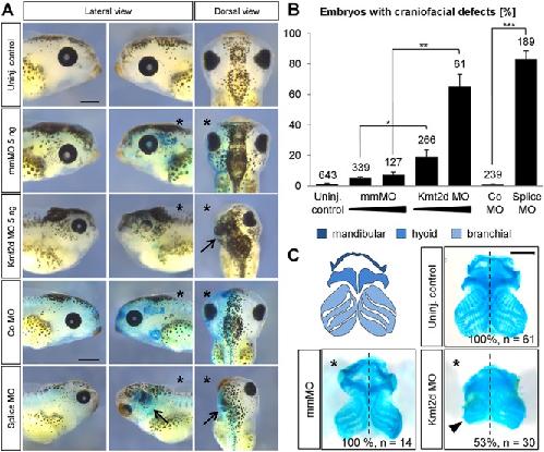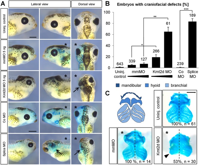 Figure 1. Kmt2d loss-of-function causes craniofacial malformations. (A) Phenotypic analysis of craniofacial defects at stage 42. Embryos were injected with 2.5â5 ng of mmMO or Kmt2d MO or 5 ng control (Co) MO or splice MO into one blastomere at the two-cell stage. 150 pg lacZ mRNA was co-injected as a lineage tracer. The injected side of the embryo is marked (asterisk). Both the Kmt2d MO and the splice MO cause severe craniofacial malformations (arrows), compared to mmMO- and Co MO-treated controls. Scale barsâ=â500 μm. (B) Graph summarizing the results from at least four independent experiments; ±SEM and the number of analyzed embryos are given for each condition. A two-tailed unpaired Studentâs t-test was applied. (C) Cartilage staining. Schematic representation of the cranial cartilage structures of a Xenopus laevis embryo (upper left panel). Embryos were injected with 2.5 ng mmMO or Kmt2d MO in combination with 50 pg mGFP mRNA as a lineage tracer into one blastomere at the two-cell stage, and the cranial cartilage was visualized by Alcian Blue staining at stage 44. Kmt2d knockdown leads to reduced cranial cartilage (arrowhead) on the injected side (asterisk). Scale barâ=â500 μm.
