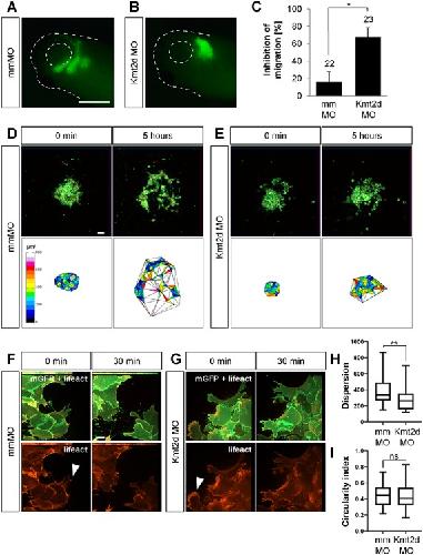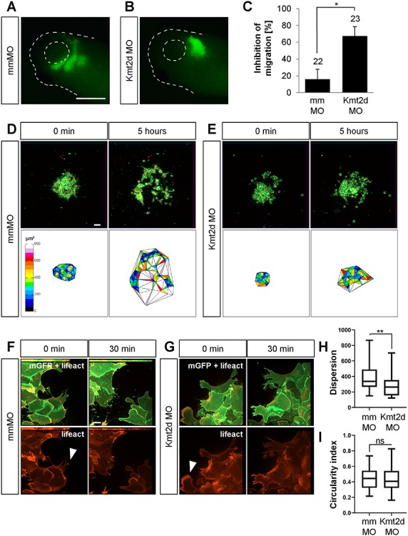Figure 3. Kmt2d is required for cell dispersion in explanted NC cells. (A and B) Transplantation assay. Embryos were injected with 2.5 ng mmMO or Kmt2d MO in combination with 50 pg mGFP mRNA into one blastomere at the two-cell stage. Fluorescently labeled NC cells from injected embryos were transplanted into a wild-type host embryo, and their migration behavior was analyzed at stage 27. Scale barâ=â500 μm. (A) While transplanted mismatch control NC cells migrate normally, (B) the migration of Kmt2d-depleted NC cells was inhibited. (C) Graph summarizing three independent experiments with ±SEM and the number of analyzed embryos given for each condition. A two-tailed unpaired Studentâs t-test was applied. (DâG) Explant assay. (D and E) Embryos were injected with 2.5 ng mmMO or Kmt2d MO in combination with 50 pg mGFP and 250 pg H2B-mCherry mRNA to label the cell membrane and the nucleus, respectively. NC cells were explanted, cultured on fibronectin, and their migration behavior was imaged for 8 h. Cell dispersion was assessed using ImageJ. Scale barâ=â50 μm. (D) mmMO NC explants show normal cell dispersion after 5 h of cultivation, while (E) Kmt2d MO-treated cells display inhibited dispersion. (F and G) Embryos were injected with 2.5 ng mmMO or Kmt2d MO in combination with 50 pg mGFP and 300 pg lifeact-RFP mRNA to label the cell membrane and f-actin, respectively. Higher magnification of explanted NC cells reveals normal protrusion formation (arrowheads) in both (F) mmMO- and (G) Kmt2d MO-treated NC cells. Scale barâ=â10 μm. (H) Dispersion of mmMO- and Kmt2d MO-injected NC explants defined as the mean triangle size per explant (μm2) calculated by Delaunay triangulation after 5 h of cultivation in three independent experiments. Box plots show median and 25th to 75th percentiles, and Whiskers display min to max values. Mann-Whitney U test was applied (nâ=â33 mmMO explants and nâ=â28 Kmt2d MO explants analyzed). (I) Analysis of circularity showed no difference in cell shape between mmMO- and Kmt2d MO-treated NC cells (complete circleâ=â1). Box plots show median and 25th to 75th percentiles. Whiskers display min to max values. Mann-Whitney U test was applied (nâ=â53 cells analyzed from 16 mmMO NC explants; nâ=â105 cells analyzed from 27 Kmt2d MO NC explants; data from three independent experiments).