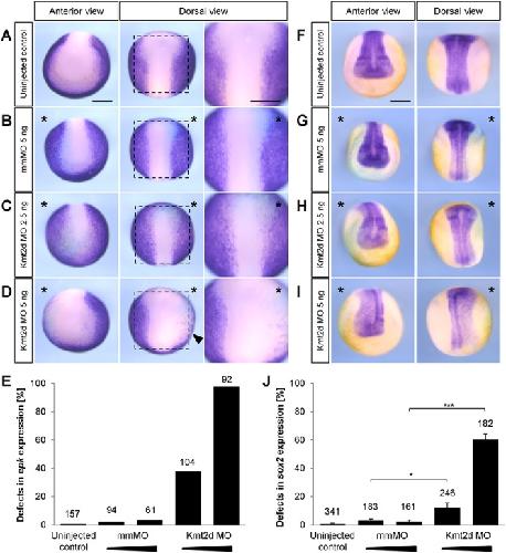 Figure 5. Kmt2d loss-of-function leads to an expansion of the neural plate as indicated by altered epidermal keratin and sox2 expression. Two-cell stage embryos were injected with 2.5 or 5 ng of mismatch (mm) MO or Kmt2d MO in combination with 100 pg lacZ mRNA as a lineage tracer. The injected side of the embryo is marked (asterisk). Scale barsâ=â500 μm. (AâD) In situ hybridization for the non-neural ectoderm marker epidermal keratin (epk) was performed at stage 14. (A) Uninjected control embryos and (B) mmMO treated controls show normal epk expression in the epidermal ectoderm. (C) While 2.5 ng Kmt2d MO has no effect in the majority of embryos, (D) 5 ng Kmt2d MO leads to a dorsolaterally reduced epk expression. (E) The graph summarizes the mean percentage of embryos with epk expression defect from two independent experiments. The total number of analyzed embryos is indicated for each condition. (FâI) In situ hybridization for the neural plate marker sox2 was performed at stage 19. (F) Uninjected control embryos and (G) mmMO treated controls show normal sox2 expression in the neural plate. (H) While 2.5 ng Kmt2d MO has no effect in the majority of embryos, (I) 5 ng Kmt2d MO leads to an expansion of the sox2-positive territory. (J) Data from four independent experiments. Graph summarizes the mean percentage of embryos with sox2 expression defect. The total number of analyzed embryos and ±SEM are indicated for each condition. A two-tailed unpaired Studentâs t-test was applied.