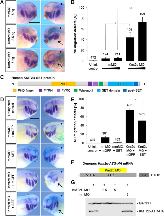 Figure 2. Kmt2d is required for cranial NC cell migration. (A) Embryos were injected with 2.5 or 5 ng mmMO or Kmt2d MO and 100 pg lacZ mRNA into one blastomere at the two-cell stage. At stage 27 NC migration was analyzed by twist whole mount in situ hybridization. Kmt2d loss-of-function leads to an inhibition of NC migration (arrows), compared to mismatch controls. The injected side of the embryo is marked (asterisk). Scale barâ=â500 μm. (B) Graph summarizing the data from three independent experiments; ±SEM and the number of analyzed embryos are indicated for each condition. A two-tailed unpaired Studentâs t-test was applied. (CâE) Rescue experiments. (C) Schematic view of motifs and functional domains of the human KMT2D-SET construct used for rescue experiments. (D) Embryos were injected into one blastomere at the two-cell stage with 3 ng mmMO or Kmt2d MO in combination with 400â500 pg mGFP or KMT2D-SET mRNA and 100 pg lacZ as a lineage tracer. NC migration was analyzed by twist in situ hybridization at stage 25. Overexpression of the human KMT2D-SET construct partially restores NC migration in Kmt2d morphants, compared to embryos injected with Kmt2d MO and mGFP mRNA (arrows). The injected side of the embryos is marked (asterisk). Error barâ=â500 μm. (E) Graph summarizing the percentage of embryos with twist defects from six independent experiments; ±SEM and number of analyzed embryos are given for each condition. A two-tailed unpaired Studentâs t-test was applied. (F) Schematic view of the Xenopus laevis Kmt2d-ATG-HA mRNA which contains the Kmt2d MO binding site. (G) To analyze the binding efficiency of the Kmt2d MO, embryos were injected at the one-cell stage with 1 ng of Xenopus Kmt2d-ATG-HA mRNA either alone or in combination with 2.5â5 ng mmMO or the translation-blocking Kmt2d MO. Protein extracts were prepared at stage 20, and the expression of Kmt2d-ATG-HA was assessed by Western Blot analysis. Injection of 2.5 and 5 ng Kmt2d MO led to a depletion of the Kmt2d-ATG-HA protein, while the expression was unaffected upon co-injection of 5 ng mmMO. GAPDH expression was used as a loading control.