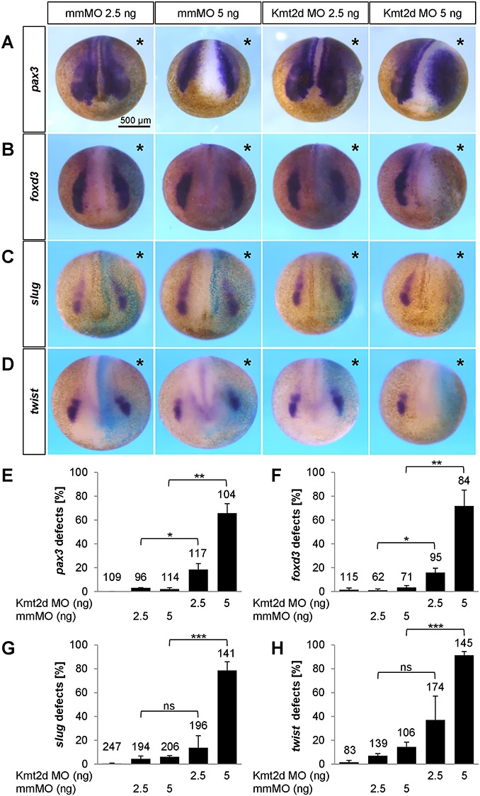 Figure 4. Kmt2d knockdown affects NPB formation and NC specification in a dose-dependent manner. (AâD) Embryos were injected with 2.5 or 5 ng mmMO or Kmt2d MO into one blastomere at the two-cell stage. 100 pg lacZ mRNA were used for lineage tracing. At neurula stages, the expression of several NC marker genes was analyzed by whole mount in situ hybridization. Injection of 5 ng Kmt2d MO leads to (A) a broader pax3 expression in the NPB region and (B) a severe reduction of foxd3, (C) slug/snai2 and (D) twist expression in the pre-migratory NC. (EâH) Graphs summarizing the results from three independent experiments for each NC marker gene analyzed in (AâD). Kmt2d loss-of-function affects the expression of (E) pax3, (F) foxd3, (G) slug/snai2 and (H) twist in a dose-dependent manner; ±SEM and the number of analyzed embryos are indicated for each condition. A two-tailed unpaired Studentâs t-test was applied.