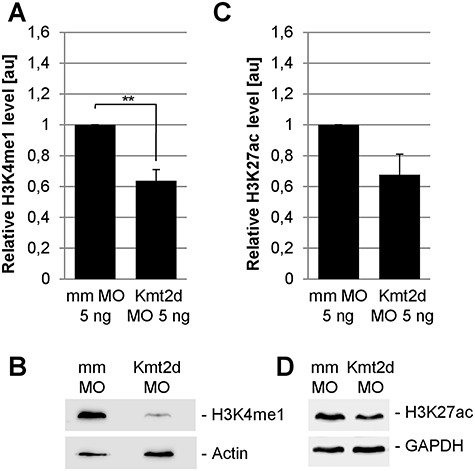 Figure 6. Loss of Kmt2d leads to reduced H3K4me1 and H3K27ac levels in Xenopus embryos. One-cell stage Xenopus embryos were injected with 5 ng mmMO or Kmt2d MO or 7.5 ng control MO or splice MO in combination with 50 pg mGFP mRNA as a lineage tracer. Protein extracts were prepared at neurula stage 20. (A and B) Western Blot analysis of the H3K4me1 mark reveals a reduction of the H3K4me1 level in Kmt2d MO treated embryos compared to controls. Graph summarizes three independent experiments and ±SEM is indicated. A two-tailed unpaired Studentâs t-test was applied. (C and D) H3K27ac Western Blot analysis shows that injection of the Kmt2d MO leads to a decrease in the H3K27ac level, compared to mismatch controls. Graph summarizes the results from four independent experiments and ±SEM is indicated; P-valueâ=â0.0519 in a two-tailed unpaired Studentâs t-test.