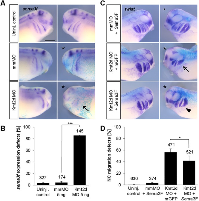 Figure 7. Kmt2d loss-of-function inhibits Sema3F expression and ectopic Sema3F can partially substitute for Kmt2d. (A) Sema3F expression is reduced in Kmt2d morphants. Embryos were co-injected with 5 ng mmMO or Kmt2d MO and lacZ mRNA as a lineage tracer. In situ hybridization for sema3f confirms that Kmt2d knockdown inhibits Sema3F expression in Xenopus embryos (arrow). (B) Graph summarizing the data from three independent experiments. Total number of analyzed embryos and ±SEM are indicated for each condition. A two-tailed unpaired Studentâs t-test was applied. (C) Two-cell stage embryos were co-injected with 2.5â3 ng Kmt2d MO and 250 pg sema3F mRNA or mGFP mRNA and subjected to twist in situ hybridization. Overexpression of Sema3F results in a partial rescue of NC migration in Kmt2d-depleted embryos. (D) Graph summarizing the data from six independent experiments. Total number of analyzed embryos and ±SEM are indicated for each condition. A Fisherâs exact test was applied.