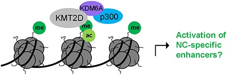 Figure 8. Working model of how KMT2D may function to activate NC-specific enhancers. KMT2D deposits H3K4me1 marks at genomic targets. p300 interaction is mediated via the KMT2D/KDM6A complex, finally leading to H3K27 acetylation and a fully active enhancer state.
