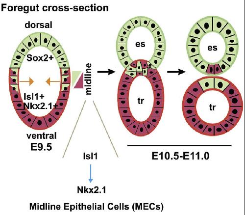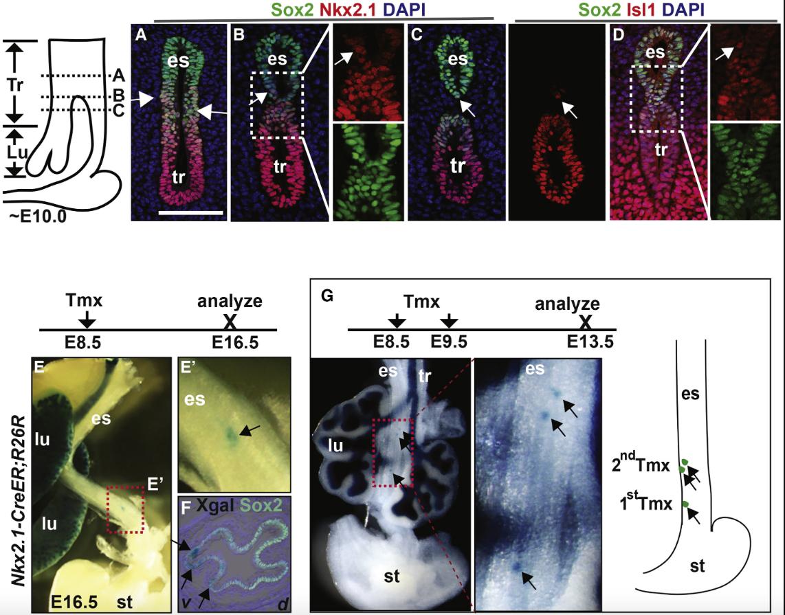 (C) Presence of a few Sox2+ Nkx2.1+ epithelial cells (arrow) in the ventralepithelium of the nascent esophagus.