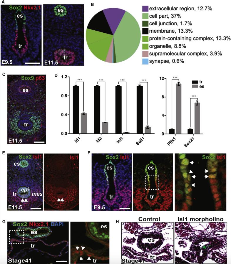 (H) Morpholino-mediated knockdown of Isl1 in X. laevis embryos leads to abnormal trachea-esophageal separation (arrow) (n = 8/14). Abbreviations: es, esophagus; tr, trachea; epi, epithelium; mes, mesenchyme. Scale bar: 50 μm. See also Figure S1.