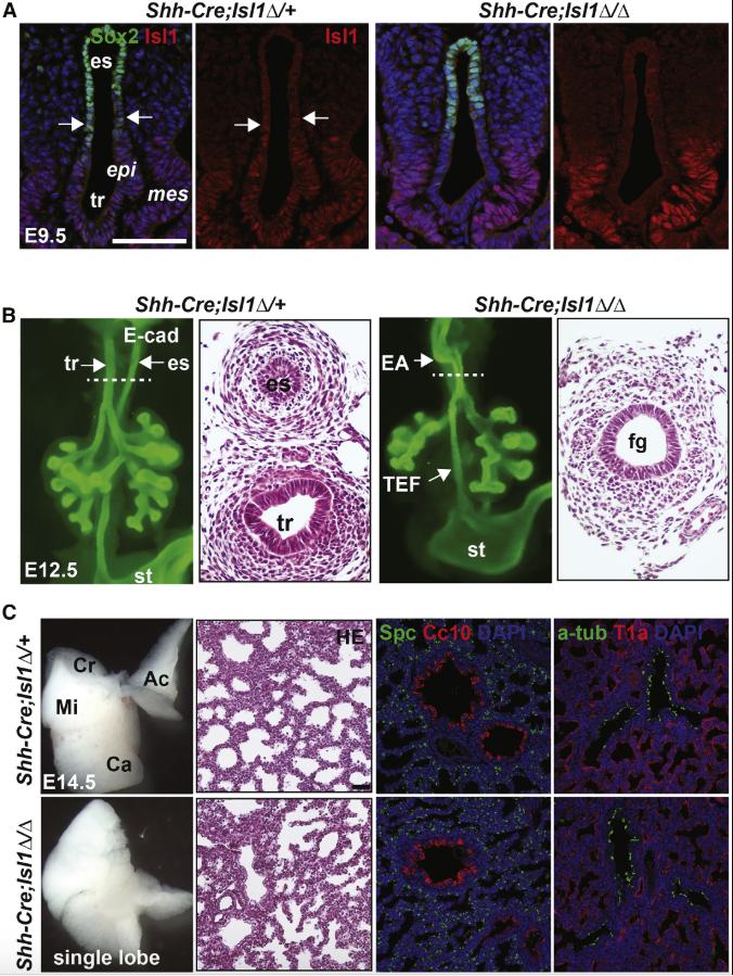 (B) Deletion of Isl1 with Sox2-CreER leads to EA/TEF in all mutants (n = 9). Samples were immunostained with an anti E-cadherin antibody.
