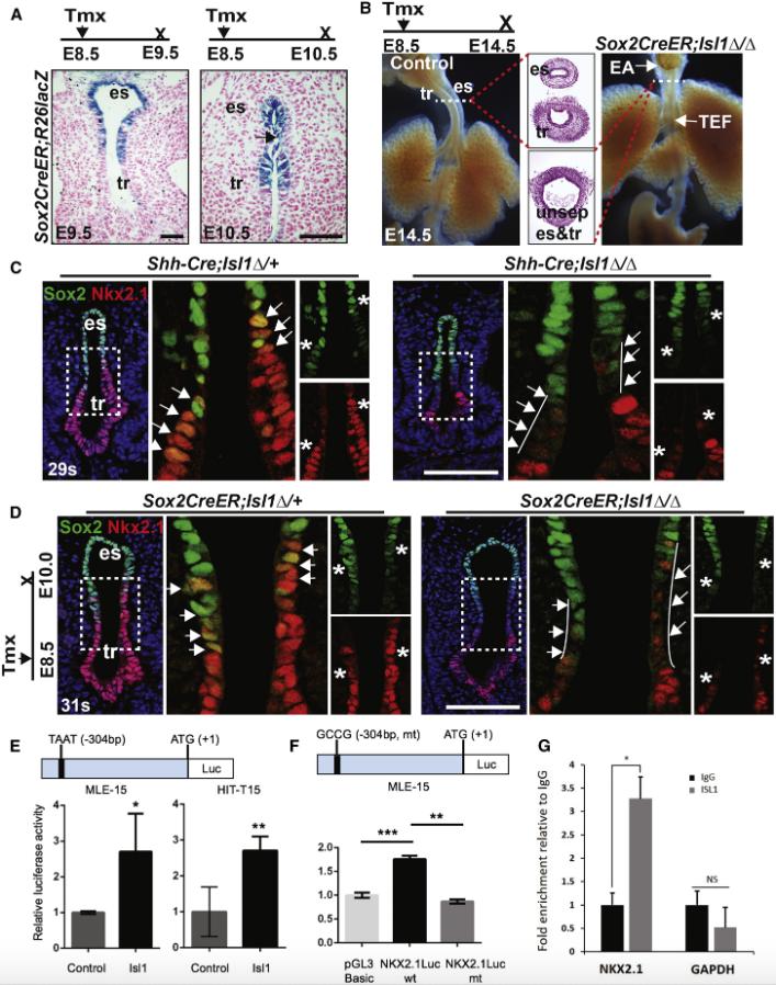 Figure 4. Isl1 Regulation of Nkx2.1 in the Boundary Population Is Critical for Trachea-Esophageal Separation