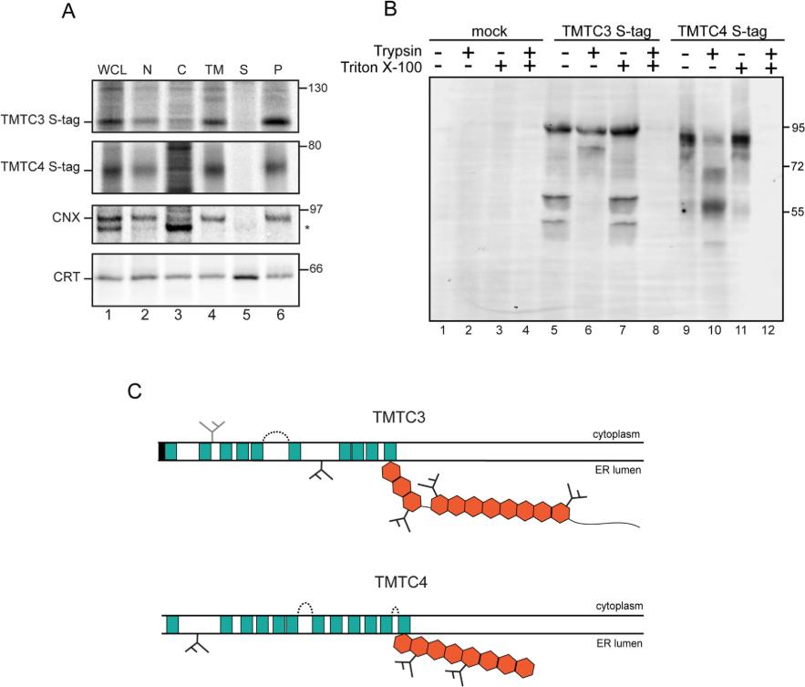 FIGURE 2:. TMTC3 and TMTC4 are transmembrane proteins with their TPR domains facing the ER lumen. (A) HEK293T cells were transfected with S-tagged TMTC3 or TMTC4 as indicated and radiolabeled for 1 h with [35S]-Cys/Met. Cells were homogenized and fractionated prior to alkaline extraction. The fractions collected were whole cell lysate (WCL), nucleus (N), cytosol (C), total membrane (TM), as well as supernatant (S), and pellet (P) fractions on alkaline extraction of the TM. All samples were subjected to affinity purification with S-tag agarose or calnexin (CNX) and CRT immunoprecipitation where indicated. Samples were analyzed via SDSâPAGE and detected via autoradiography. (B) TMTC3 S-tag and TMTC4 S-tag were expressed in HEK293T cells. Cells were homogenized and microsomes were isolated by ultracentrifugation then resuspended in homogenization buffer. Aliquots of the ER microsomes were incubated for 15 min at 27°C with or without Triton X-100 and trypsin where indicated. Samples were separated on 9% SDSâPAGE and immunoblotted for the S-tag epitope. (C) Putative trypsin protease cleavage areas (dashed line) on TMTC3 and TMTC4 based on exposed potential cleavage residues and size of cleaved bands in B. Orange hexagons represent ER lumenâfacing TPR motifs. |