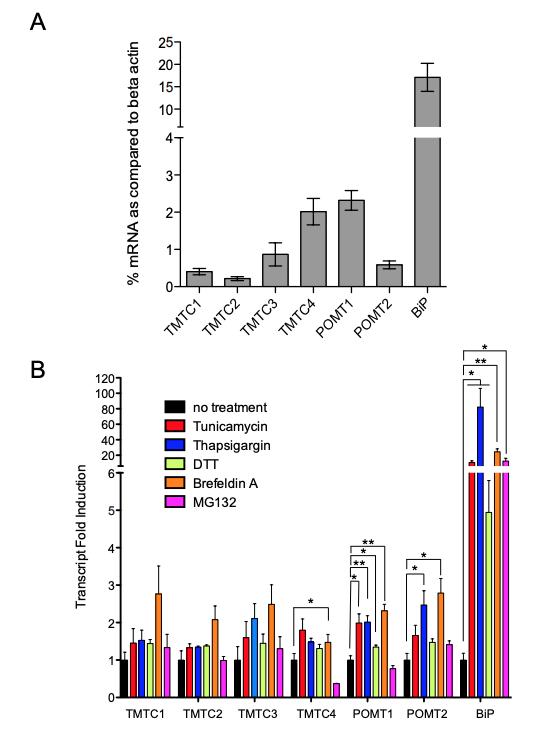 Supplemental Figure 2. Basal transcript abundance and fold induction of TMTC proteins by ER stress. (A) RNA from HEK293A cells, grown under normal conditions, was harvested. RNA was reverse transcribed to cDNA followed by qRT-PCR with appropriate primers. Basal mRNA abundance was assessed using β-actin as a reference. Error bars represent standard error from at least three independent experiments. (B) HEK293A cells were treated with regular growth media or with 2 mM DTT for 2 hr, 1 μg/mL tunicamycin, 3 μM thapsigargin, 2.5 μg/mL brefeldin A or 2.5 μM MG132 for 24 hr prior to RNA purification. RNA was reverse transcribed to cDNA followed by qRT-PCR with appropriate primers, and changes in gene expression were calculated using β-actin as a reference. Statistical significance between treatment groups was determined using an unpaired T test. * and ** indicates a P-value of less than 0.05 and 0.01, respectively. Error bars represent standard deviation from at least three independent experiments. |