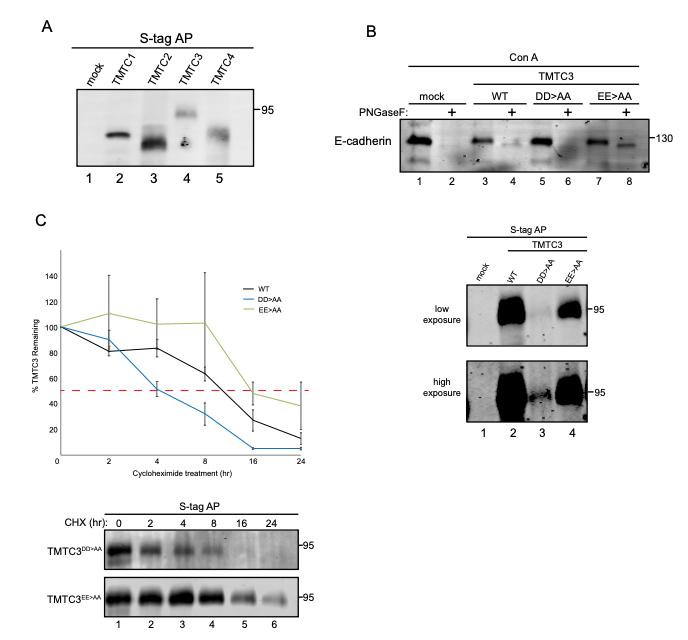 Supplemental Figure 3. Deletion of TMTCs and E-cadherin. (A) S-tagged TMTC1, 2, 3 or 4 cDNA was transfected into HEK293SC/TMTC1,2,3,4 cells. Cell lysates were collected and one third was subjected to affinity purification with S-protein agarose. Samples were then analyzed by 6% SDS-PAGE and immunoblotted for the S-tag epitope to assess levels of TMTC1, 2, 3 and 4, respectively. (B) HEK293SC/TMTC1,2,3,4 cells were transfected with S-tagged TMTC3 WT or putative active site mutant (DD>AA or EE>AA) cDNA. Lysates were collected and split, one third subjected to treatment with endoglycosidase PNGaseF (lanes 2, 4, 6, 8 and 10), prior to pulling down glycosylated proteins with concanavalin A (Con A). One third was subjected to affinity purification with S-protein agarose. Samples were then analyzed by 6% SDS-PAGE and immunoblotted with E-cadherin antisera (top blot) or S-tag antisera to assess levels of TMTC3 (lower blots). Lower panel represents the upper panel S-tag blot at a higher exposure to see the diminished expression of the DD>AA mutant (lane 3) (C) HEK293T cells were transfected with S-tagged TMTC3 WT or putative active site mutant cDNA as indicated. Cells were treated with 100 μg/mL cycloheximide for the indicated time prior to collection in lysis buffer. Samples were subjected to affinity purification with S-protein agarose and analyzed via 9% SDS-PAGE and immunoblotted for the S-tag epitope. Time points were collected at 0, 2, 4, 8, 16 and 24 hr after cycloheximide treatment. The amount of TMTC3 protein remaining at 2, 4, 8, 16 and 24 hr was quantified and normalized to the starting material (0 h) and averaged from three independent experiments. Error bars represent standard error of the mean (upper panel). |