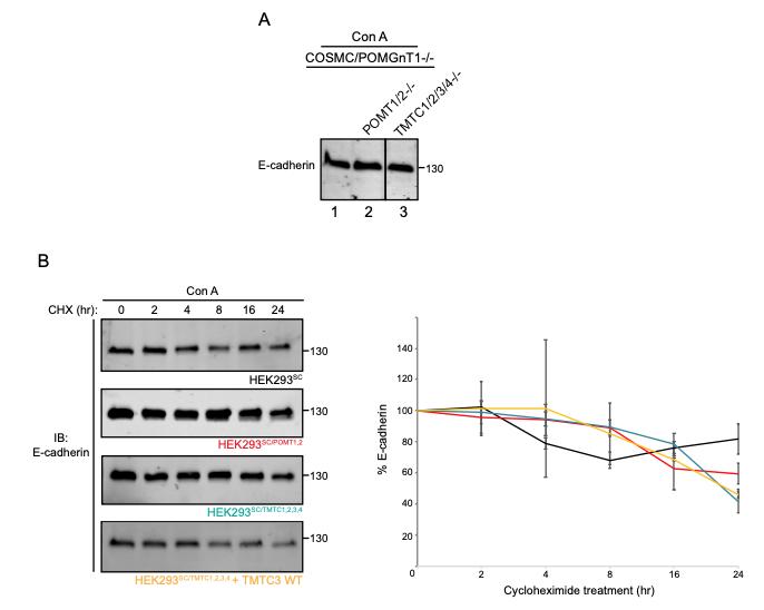Supplemental Figure 4. Deletion of TMTCs and E-cadherin. (A) Expression and stability of E-cadherin was assessed in O-mannosyltransferase knockout cells to determine effects of O-glycosylation. HEK293SC, HEK293SC/POMT1,2 and HEK293SC/TMTC1,2,3,4 cells were lysed and total protein amount was assessed via Bradford assay. Equal amounts of protein were subjected to pull-down via Con A prior to samples being analyzed by 9% SDS-PAGE and immunoblotted with E-cadherin antisera to monitor levels of E-cadherin. (B) Previously described cell lines were treated with 100 μg/mL cycloheximide for indicated time (0, 2, 4, 8, 16 and 24 hr) prior to lysis, total protein quantification and subsequent affinity purification with Con A. Samples were then analyzed by 9% SDS-PAGE (left panel) and the amount of E-cadherin remaining at 2, 4, 8, 16 and 24 hr was quantified and normalized to the starting material (0 h) (right panel). Error bars represent standard error of the mean. |