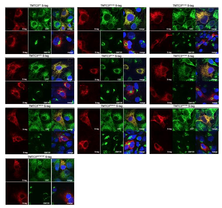 Supplemental Figure 6. Cellular localization of TMTC3 disease variants. Cellular localization of TMTC3 disease variants was investigated by confocal microscopy. Cos7 cells were transfected with TMTC3 disease variant cDNA. Fixed cells were stained with S-tag, ERp57 (ER) or GM130 (Golgi) antisera. Nuclei were visualized by DAPI staining (blue). |