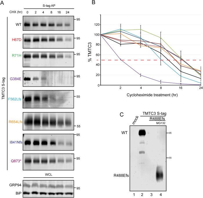 FIGURE 5:. TMTC3 WT and disease variant stability. (A) HEK293T cells were transfected with S-tagged TMTC3 WT or disease variant cDNA as indicated. Cells were treated with 100 μg/ml cycloheximide for the indicated time prior to collection and lysed in MNT, and samples were subjected to affinity purification with S-protein agarose. Reducing sample buffer was added and samples were analyzed via 9% SDSâPAGE and immunoblotted for the S-tag epitope. Cell lysates were also subjected to precipitation with 10% TCA, analyzed via 9% SDSâPAGE, and immunoblotted with KDEL antisera to determine stability of GRP94 and BiP (WCL). (B) Time points were collected at 0, 2, 4, 8, 16, and 24 h after cycloheximide treatment. The amount of TMTC3 protein remaining at 2, 4, 8, 16, and 24 h was quantified and normalized to the starting material (0 h) and averaged from three independent experiments. Error bars represent SEM. (C) HEK293T cells were transfected with S-tagged TMTC3 WT or the TMTC3 R488Efs disease variant as indicated. Cells transfected with the TMTC3 R488Efs variant were treated with 20 μM MG132 for 12 h prior to collection and lysis in MNT (lane 4). Samples were subjected to affinity purification with S-protein agarose and analyzed via SDSâPAGE prior to immunoblotting for the S-tag epitope. |
