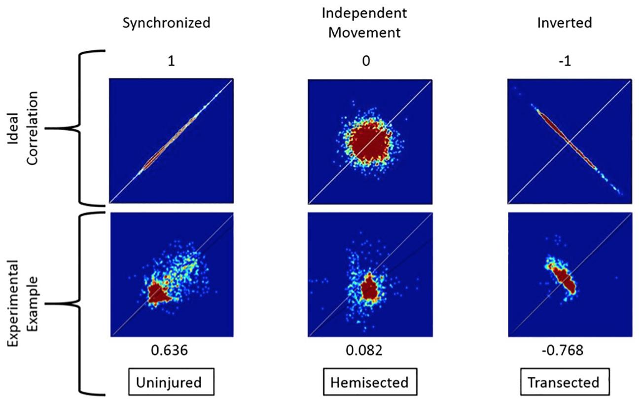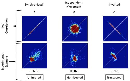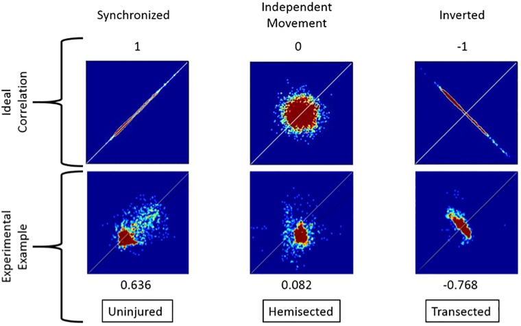 Figure 1. Synchronization variance in 2D heatmaps and the expected output of each behavior. An example is given of each type of froglet compared to the ideal correlation of each of the three types of synchronization, previously defined as: synchronized, independent and inverted. Rows show: type of movement, ideal correlation, ideal distribution, one experimental example, measured correlation and original class, respectively.