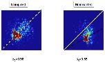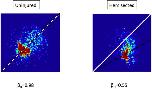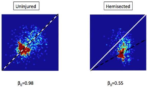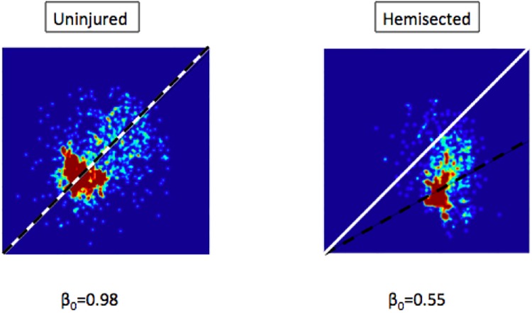 Figure 2. Symmetry variance in 2D heatmaps. Two experimental examples illustrate how a difference in symmetry is reflected in the heatmaps. The white line shows perfect symmetry, while the black-dashed line shows the corresponding line of the estimated slope β0. We can see that in the healthy froglet both black and white lines are almost the same, giving a β0 almost equal to 1. On the other hand, in the hemisected froglet the right foot tends to move approximately half the distance of the left foot's stroke, making white and black lines differ significantly, thus showing a lack of symmetry.
