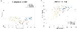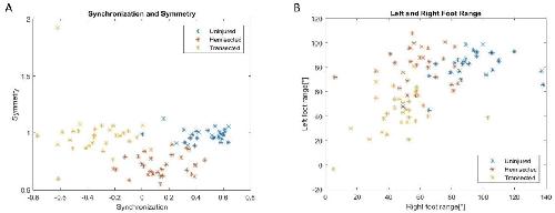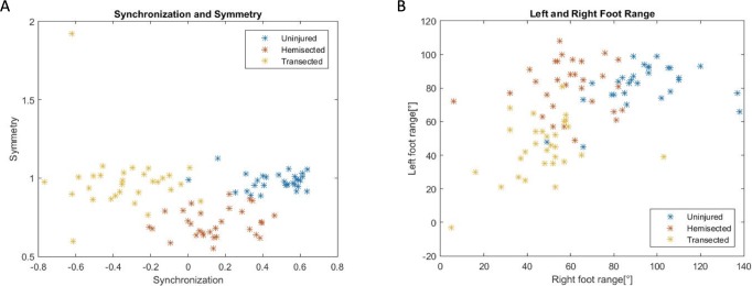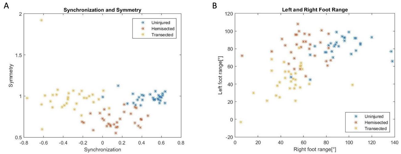 Figure 3. Examples of distribution in the feature space of the 90 videos using two kinematic features. They are colored with their original class (uninjured, hemisected and transected). In panel A the features synchronization (F1) and symmetry (F2) are shown, whereas in panel B features of right and left foot angles range (F3 and F4) are shown.