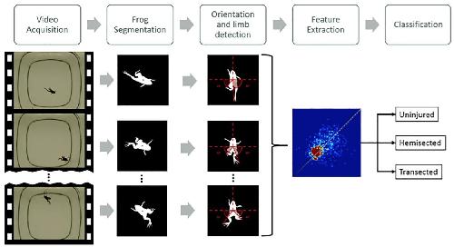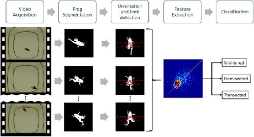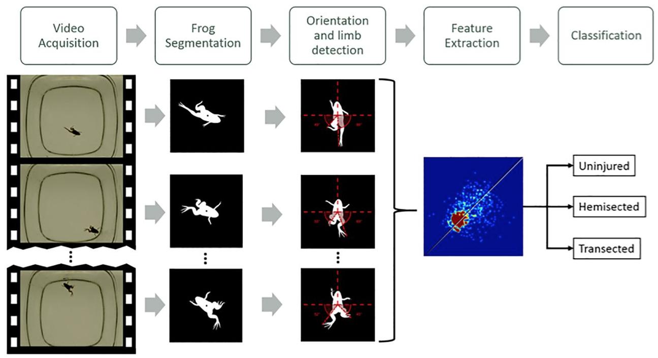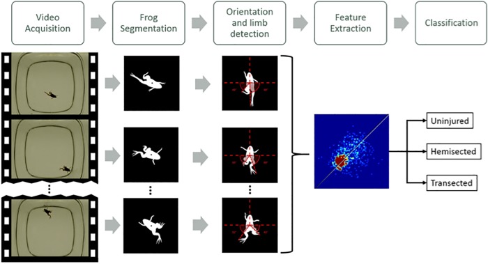 Figure 5. Diagram illustrating the five step process for each video. The whole video is processed frame by frame and then summarized in the feature extraction phase. Finally, the video is classified into one of the three levels of spinal cord damage.