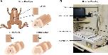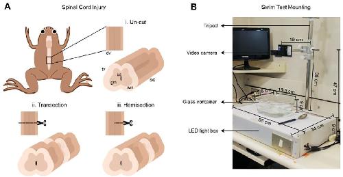 Figure 6. Experimental Setup. (A) Illustration of spinal cord injuries in the 6th vertebrae of X. laevis froglets in the dorsal and frontal views, (i) uninjured, (ii) transected and (iii) hemisected animals. (B) Picture of the setup used to record the movies of froglets. The tripod where the video camera is placed, a box internally illuminated with LED lights, a glass container with Barth solution and a spoon and a Pasteur pipette for swimming stimulation of froglets. fv, frontal view; dv, dorsal view of the spinal cord; sc, spinal cord; gm, grey matter; wm, white matter; cc, central canal.