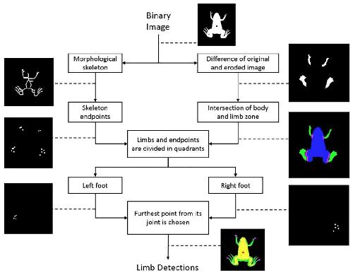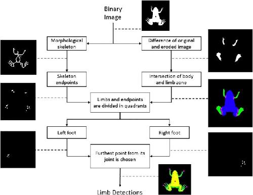 Figure 7. Diagram showing the steps to detect the frogletâs limbs. The algorithm detects limb zones, joint zones and endpoints for each of the four quadrants. Each limb is defined by the endpoint furthest from its joint.
