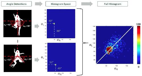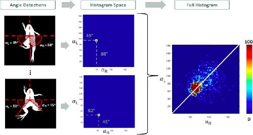 Figure 8. Example of a 2D histogram is constructed and outputted by the algorithm. In the examples, the angle-pairs (αR, αL) are 49°, 88° and 52°, 45°. For these frames, the bins â 49, 88 and 52, 45 â of the 2D histogram are increased by one. The histogram is represented on the right as a heatmap with a color scale; the deepest red value is associated with the most common angle-pair observed throughout the video, while the blue is associated with an angle-pair not seen during the video. The white line represents perfect symmetry, meaning that both feet are horizontally mirroring.