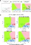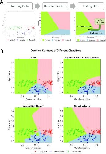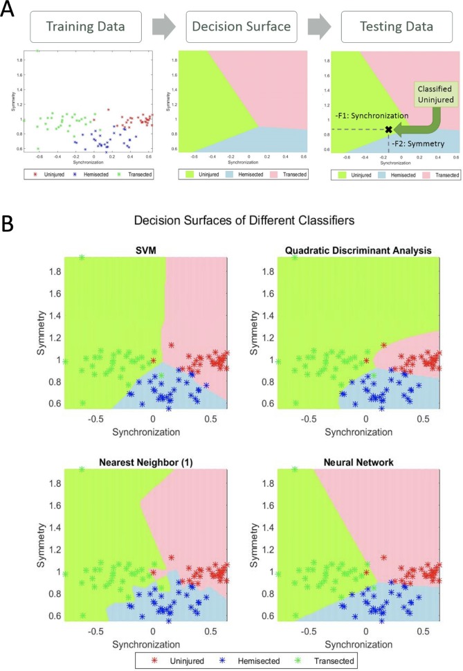 all 90 videos using two features: synchronization (F1) and symmetry (F2). (A) Diagram of a classification process. Labeled training data is computed to a decision surface of the feature space. This is a mathematical formula that depends on the type of classifier. New data can be tested and classified depending where it falls in the decision surface. (B) Different classifiers and how they divide the feature space in decision boundaries.