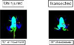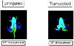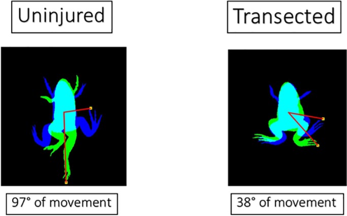 Figure 4. Two examples of the right foot range (F3) measured. The blue shadow shows the moment where the froglet has its foot in the highest position, while the green is the lowest position. The range is defined as the arc between the highest and lowest position. The healthy froglet has a relatively large range of movement while the transected one only moves it's pelvis, having a relatively small range of movement.