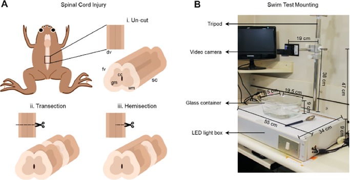 Fig. 6. Experimental Setup. (A) Illustration of spinal cord injuries in the 6th vertebrae of X. laevis froglets in the dorsal and frontal views, (i) uninjured, (ii) transected and (iii) hemisected animals. (B) Picture of the setup used to record the movies of froglets. The tripod where the video camera is placed, a box internally illuminated with LED lights, a glass container with Barth solution and a spoon and a Pasteur pipette for swimming stimulation of froglets. fv, frontal view; dv, dorsal view of the spinal cord; sc, spinal cord; gm, grey matter; wm, white matter; cc, central canal.