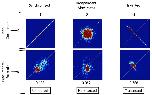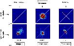 Fig. 1. Synchronization variance in 2D heatmaps and the expected output of each behavior. An example is given of each type of froglet compared to the ideal correlation of each of the three types of synchronization, previously defined as: synchronized, independent and inverted. Rows show: type of movement, ideal correlation, ideal distribution, one experimental example, measured correlation and original class, respectively.