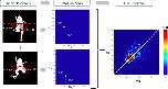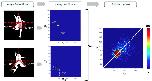 Fig. 8. Example of a 2D histogram is constructed and outputted by the algorithm. In the examples, the angle-pairs (αR, αL) are 49°, 88° and 52°, 45°. For these frames, the bins â 49, 88 and 52, 45 â of the 2D histogram are increased by one. The histogram is represented on the right as a heatmap with a color scale; the deepest red value is associated with the most common angle-pair observed throughout the video, while the blue is associated with an angle-pair not seen during the video. The white line represents perfect symmetry, meaning that both feet are horizontally mirroring.