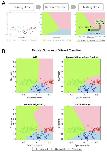Figure 9. Examples of the output of a classifier plotting all 90 videos using two features: synchronization (F1) and symmetry (F2). (A) Diagram of a classification process. Labeled training data is computed to a decision surface of the feature space. This is a mathematical formula that depends on the type of classifier. New data can be tested and classified depending where it falls in the decision surface. (B) Different classifiers and how they divide the feature space in decision boundaries.