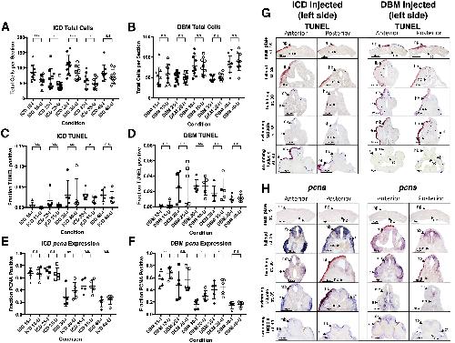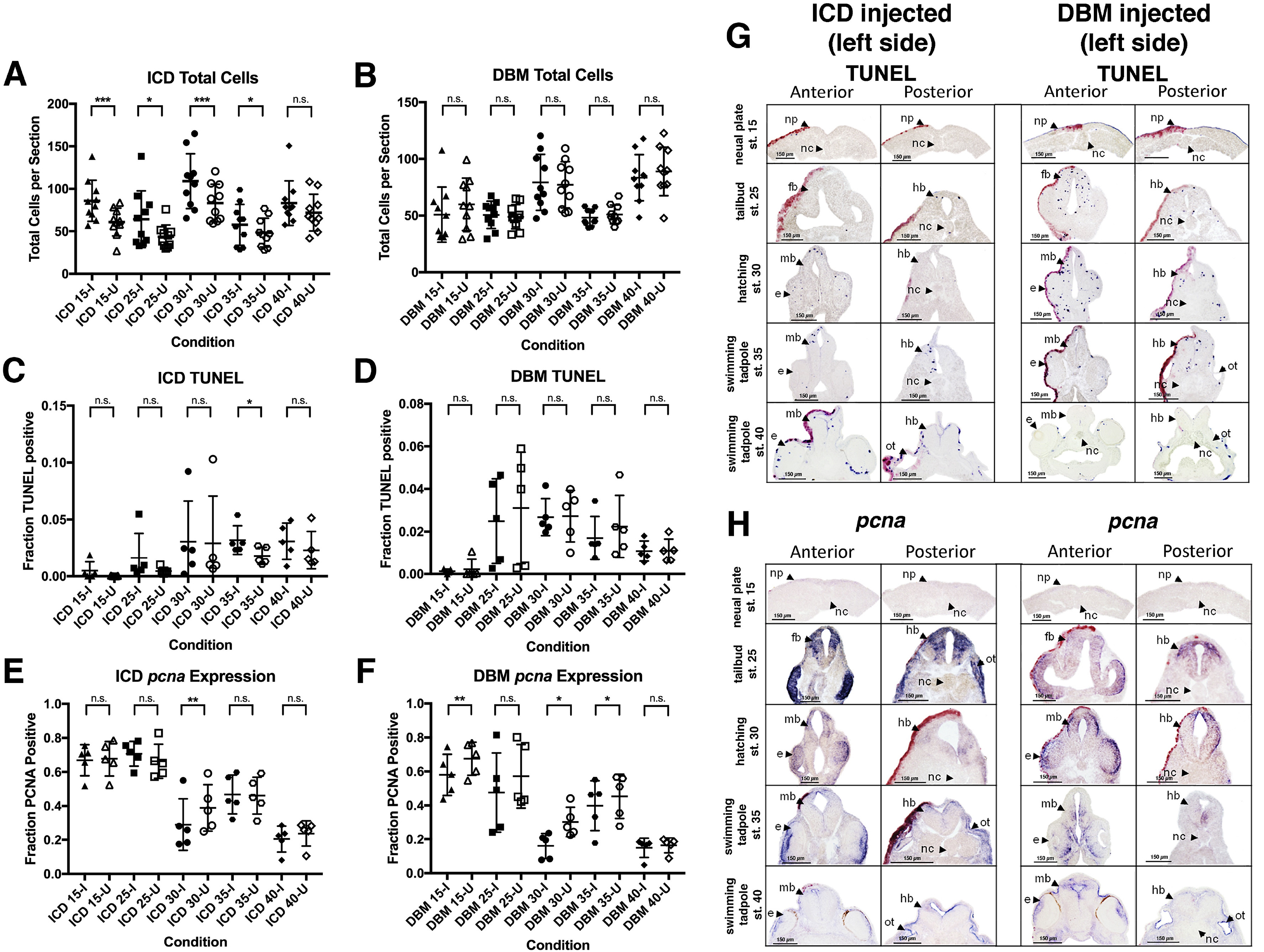 Fig. 4. Apoptosis and proliferation in response to Notch perturbation. Total number of neural cells were measured in injected and uninjected sides of embryos over time in response to ICD injection (A) and DBM injection (B) (n â= â10; * â= âp â⤠â0.05). Subsequently, the proportion of cells positive for TUNEL staining was measured on the injected (I) and uninjected (U) sides (C, D) (n â= â5; * â= âp â⤠â0.05, ** â= âp â⤠â0.01 *** â= âp â⤠â0.001). Next, the proportion of neural cell expressing pcna was measured in injected and uninjected sides of embryos (E, F) (n â= â5; * â= âp â⤠â0.05). Representative images of TUNEL staining and pcna expression in Notch perturbed embryos are shown in G and H, respectively. All embryos shown are left-side injected. Abbreviations: np, neural plate; nc, notochord; fb, forebrain; hb, hindbrain; mb, midbrain; e, eye; ot, otic vesicle.