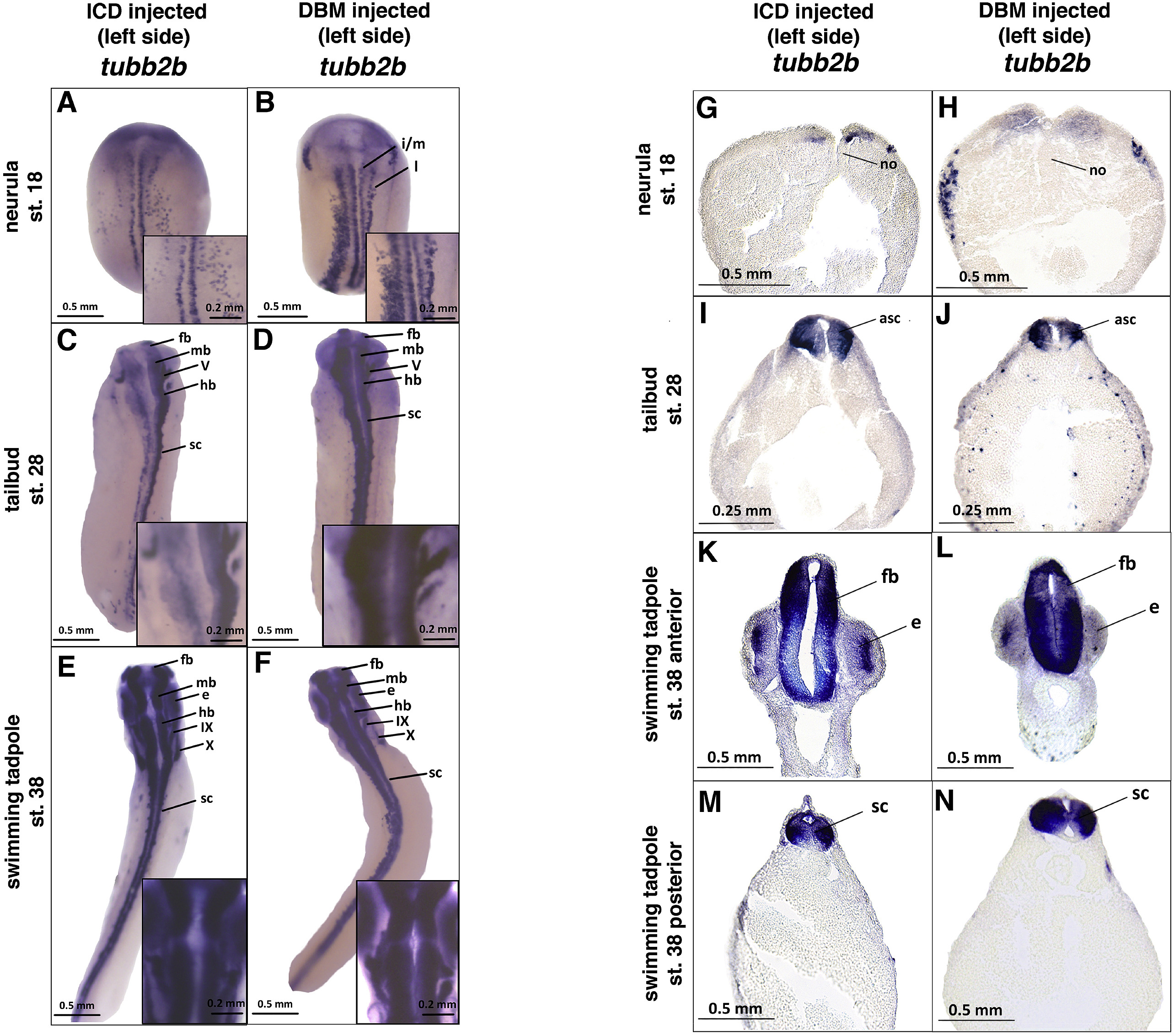 Fig. 1. tubb2b expression in response to Notch perturbation. Embryos unilaterally injected with 1.5 âng ICD or DBM show perturbed expression of tubb2b at neurula stages on the injected (left) side (A, B, G, H). The difference in expression between sides is less stark at the tailbud stage (C, D, I, J), and minimal difference between sides is apparent at the swimming tadpole stage (E, F, KâN). All embryos shown are left-side injected. Histological analysis of tubb2b expression in Notch perturbed embryos supports whole-mount findings (G-N). Abbreviations: l, lateral longitudinal stripe of primary neurogenesis; i/m, intermediate/medial longitudinal stripes of primary neurogenesis; asc, anterior spinal cord; e, eye; fb, forebrain; hb, hindbrain; mb, midbrain; sc, spinal cord; V, cranial nerve V; IX, cranial nerve IX; X, cranial nerve X. For each stage and each condition, N = >100 for whole mount embryos and >15 for histological analyses.