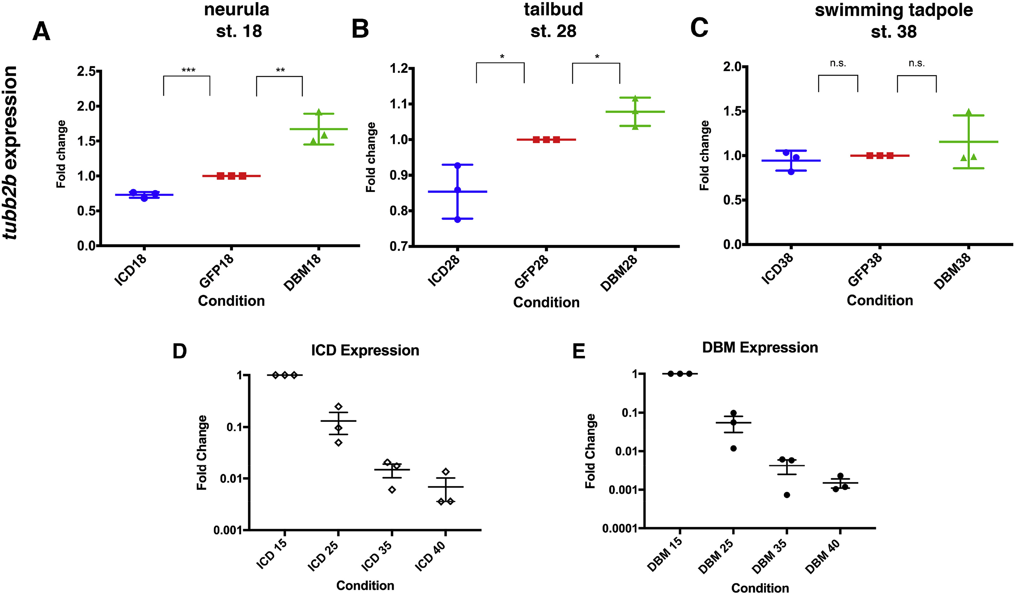 Fig. 2. Quantification of tubb2b expression and construct persistence. qRT-PCR confirms that ICD injected embryos express less tubb2b, while DBM injected embryos express more tubb2b at the neurula stage (A). tubb2b expression remains perturbed at the tailbud stage (B), but at the swimming tadpole stage, no difference in expression level is detected when comparing perturbed embryos to vehicle-injected controls (n â= â3) (C). qRT-PCR shows that while ICD (D) (n â= â3) and DBM (E) (n â= â3) mRNAs degrade over time, both are still detectable throughout the swimming tadpole stages. Bars represent mean â± âSEM. * â= âp â< â0.05, ** â= âp â< â0.01.