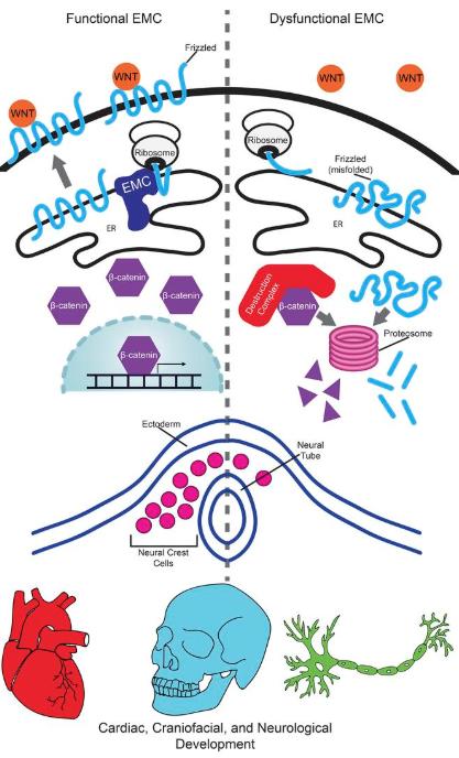 Multipass membrane proteins have a myriad of functions, including transduction of cell-cell signals, ion transport, and photoreception. Insertion of these proteins into the membrane depends on the endoplasmic reticulum (ER) membrane protein complex (EMC). Recently, birth defects have been observed in patients with variants in the gene encoding a member of this complex, EMC1. Patient phenotypes include congenital heart disease, craniofacial malformations, and neurodevelopmental disease. However, a molecular connection between EMC1 and these birth defects is lacking. Using Xenopus, we identified defects in neural crest cells (NCCs) upon emc1 depletion. We then used unbiased proteomics and discovered a critical role for emc1 in WNT signaling. Consistent with this, readouts of WNT signaling and Frizzled (Fzd) levels were reduced in emc1-depleted embryos, while NCC defects could be rescued with β-catenin. Interestingly, other transmembrane proteins were mislocalized upon emc1 depletion, providing insight into additional patient phenotypes. To translate our findings back to humans, we found that EMC1 was necessary for human NCC development in vitro. Finally, we tested patient variants in our Xenopus model and found the majority to be loss-of-function alleles. Our findings define molecular mechanisms whereby EMC1 dysfunction causes disease phenotypes through dysfunctional multipass membrane protein topogenesis.