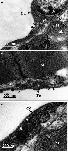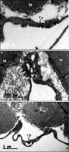 Figure 5. Telopodeâtelopode contact. Most of the CTs link with other CTs via connections between the far ends of their telopodes (AâC). Two types of telopodeâtelopode contacts are observed: (1) a gapâjunctionâlike structure coming into nanometerârange contact, in which some areas make nanometerârange contact and other areas have a structure resembling one to two gap junctions (white arrow); (2) a nanometerârange contact that does not have a wellâestablished junction at the far end of the telopodes in which two telopodes closely connect at a distance of approximately 1â2 nm (white small triangle). Scale bar: Size as shown in the figures. C: Collagen and extracellular matrix; M: Cardiomyocyte; Tp: Telopode