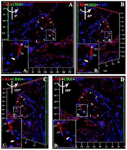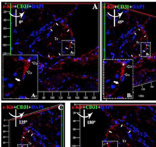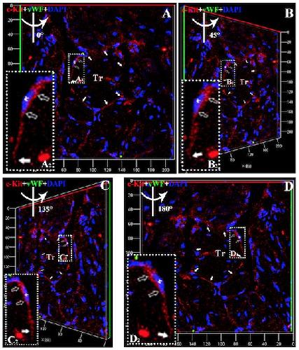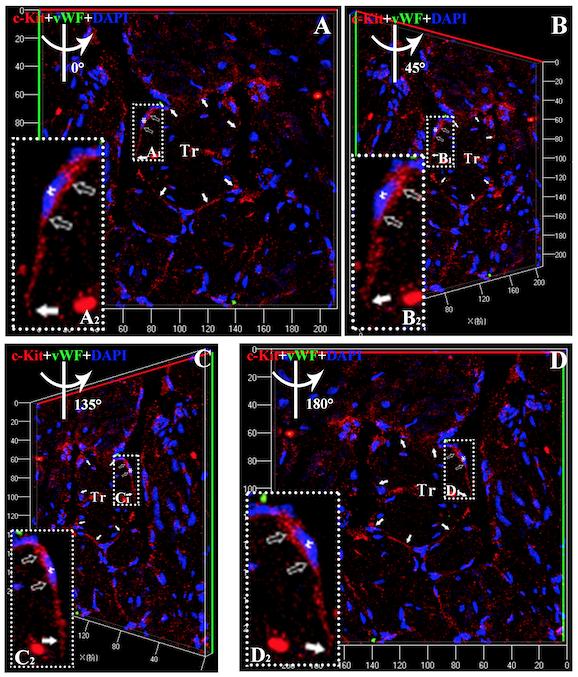 Fig. S3: Three-dimensional reconstruction of Figure S2D. A: Three-dimensional reconstruction of Figure S2 in Z-axis. B: 45 degree rotation of A in y-axis. C: 135 degree rotation of A in y-axis. D: 180 degree rotation of A in y-axis. Showing CTs (c-Kit positive) is around the trabeculae of X. tropicalis myocardium (white arrow) and the representative cell body (open arrow) and part of telopode of CTs (white arrow) in higher magnification (A2-D2) of selected area (white dot line rectangle; A1-D1) respectively. Red: anti-c-Kit; Green: anti-vWF; Blue: DAPI. Tr: Trabecula of the myocardium.