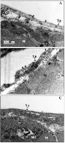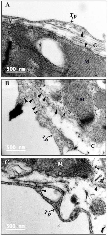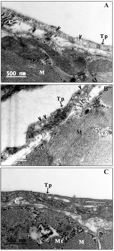 Figure 4. Vesicles and caveolae of CTs. Many vesicles (arrowhead) or coated vesicles (white arrowhead) are present in the telopodes. In addition, many caveolae are present in the membrane of the cell body and telopode (small triangle). The opening site of caveolae faces the extracellular space, and some vesicles or coated vesicles are located near the opening site of caveolae (AâC). C: Collagen and extracellular matrix; CT: Cardiac telocyte; M: Cardiomyocyte; Mt: Mitochondria; N: Nucleus. Scale bar: Size as shown in the figures; Tp: Telopode