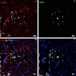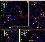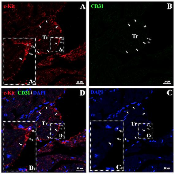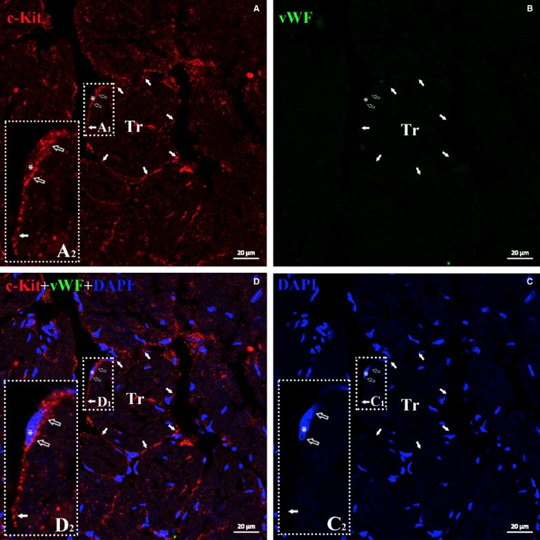 Figure 2. TEM identified CTs in myocardium is câKitâpositive but vWFânegative. Double immuofluorescent staining for antiâcâKit (red) and vWF (green) demonstrated câKit+ and vWFâ cells with very small cell bodies (open arrow), a nucleus (approximately 1:1 ratio of the cytoplasm to the nucleus; white asterisk) and extremely thin prolongation (telopode) around trabeculae in the Xenopus tropicalis myocardium (white arrow). Showing that TEM identified CTs express câKit, a generally accepted marker of CTs, but not vWF, a unique marker of endothelial cell. A, AntiâcâKit (red); B, AntiâvWF (green); C, DAPI; D, merged of A, B and C. A2, C2 and D2 are higher magnification of A1, C1 and D1, respectively, which are showing the cell body and part of telopode of CTs. Scale bar: 20 μm. Tr: Trabecula of the myocardium