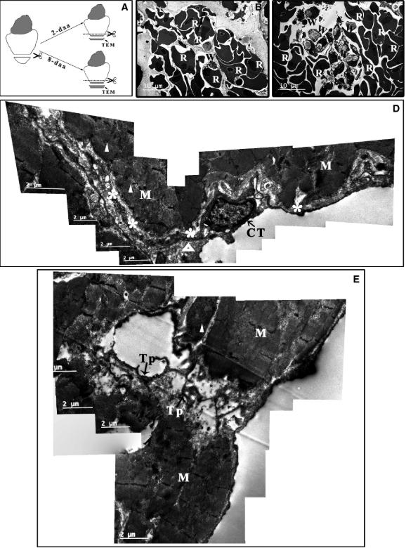 Figure 6. TEM analysis of the Xenopus tropicalis myocardium 2 d after injury. A, Schematics of the region of TEM analysis. Two days after amputation, red blood cells (B) and inflammatory cells (C) accumulate in the wound. Myofibres are disorganized in some cardiomyocytes on the border of the wound (white triangle), and disorganized telopodes of some CTs (white asterisk) are found. There are some clot structures in the extracellular space (open triangle) (D). In addition, some network structures consisting of disorganized telopodes and extracellular matrix tissue but lacking cardiomyocytes are present in the wound area (E). Scale bar: Size as shown in the figures. Asterisk: Disorganized telopode; C: Collagen and extracellular matrix; CT: Cardiac telocyte; M: Cardiomyocyte; Open triangle: Clot structure; R: Red blood cell; Tp: Telopode; W: Inflammatory cell; White Triangle: Disorganized myofibre