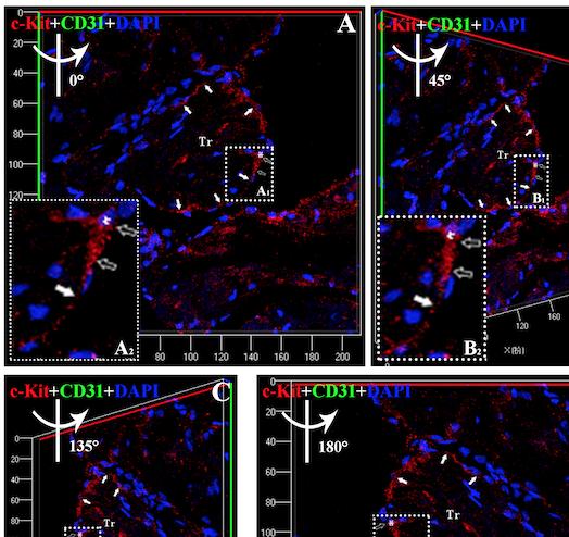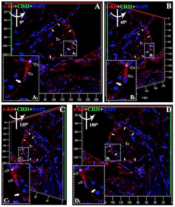 Fig. S1: Three-dimensional reconstruction of Figure 2D. A: Three-dimensional reconstruction of Figure 2 in Z-axis. B: 45 degree rotation of A in y-axis. C: 135 degree rotation of A in y-axis. D: 180 degree rotation of A in y-axis. Showing CTs (c-Kit positive) is around the trabeculae of X. tropicalis myocardium (white arrow) and the representative cell body (open arrow) and part of telopode of CTs (white arrow) in higher magnification (A2-D2) of selected area (white dot line rectangle; A1-D1) respectively. Red: anti-c-Kit; Green: anti-vWF, Blue: DAPI. Tr: Trabecula of the myocardium.