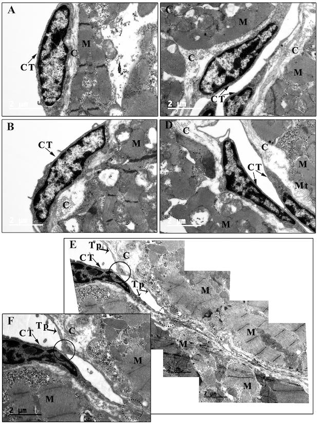 Fig. S5: Contact between CTs and cardiomyocytes. The CT cell body does not contact or form a junction with cardiomyocytes. Many microfilaments that are arranged as a vertical and horizontal network with collagen fill the gap to link the CT cell body with cardiomyocytes (A-F). In addition, the cell body of one CT is able to closely connect with the cell body of another CT (D), and the cell body of one CT is able to form a nanometer-range connection with the telopode of another CT (E,F; circle). Distinct from contacts between the far ends of telopodes from different CTs, two telopodes from different CTs are able to form a nanometer-range connection via a gap-juction-like structure (E, F; dotted line circle). Scale bar: Size as shown in the figures. CT: Cardiac telocyte. C: Collagen and extracellular matrix. Mt: Mitochondria. M: Cardiomyocyte. Tp: Telopode.