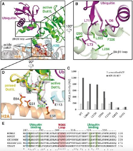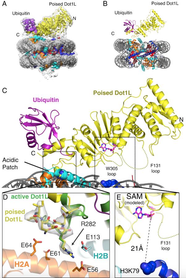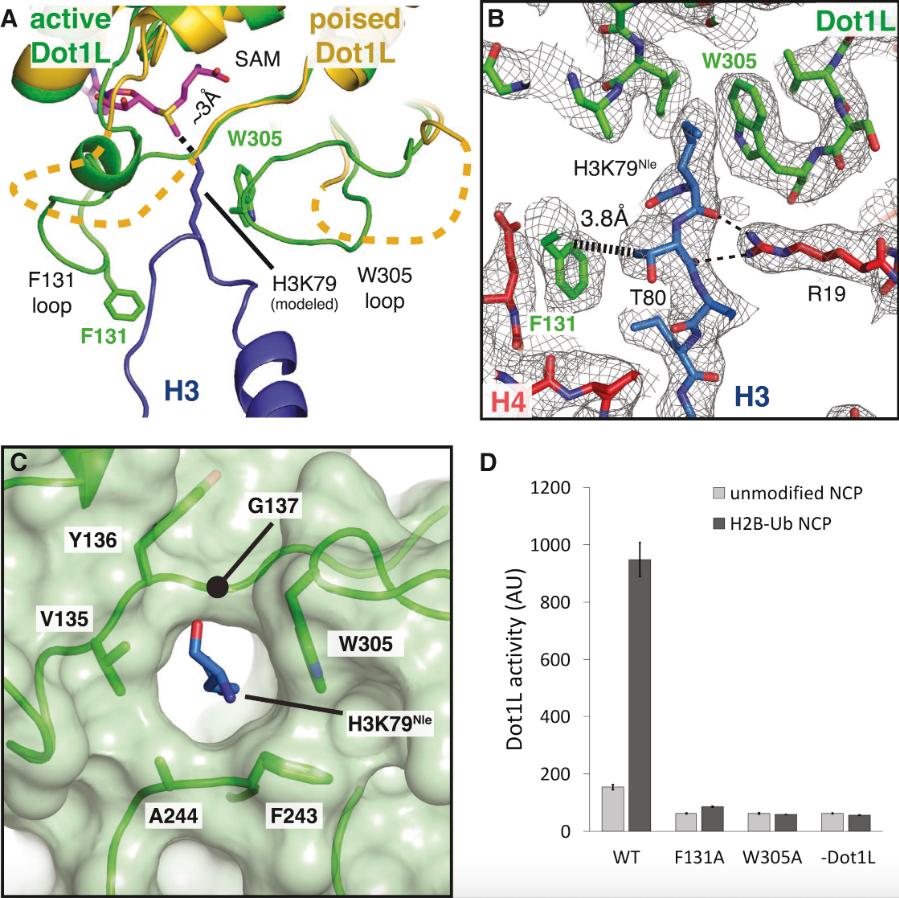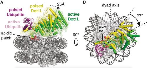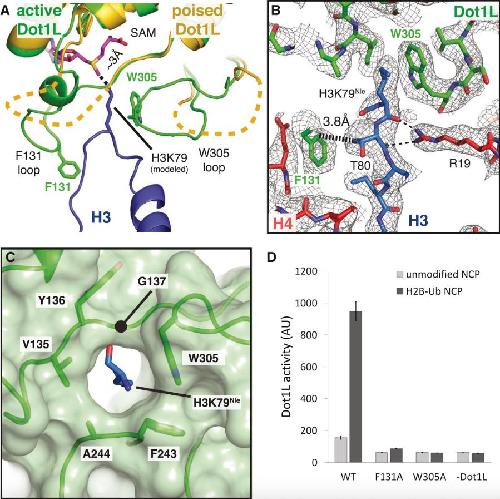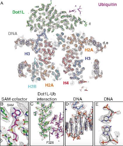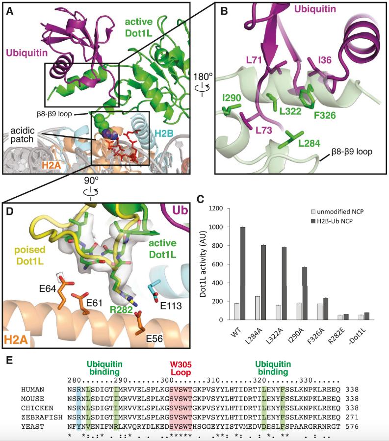 Zhou, Evidence that ubiquitylated H2B corrals hDot1L on the nucleosomal surface to induce H3K79 methylation. 2016, Pubmed