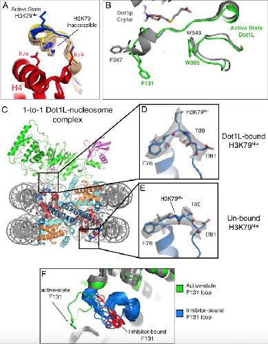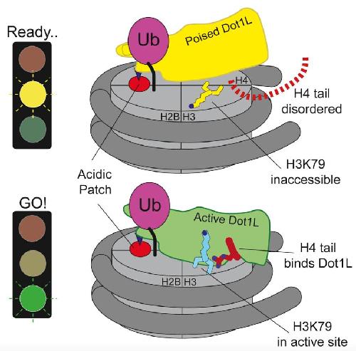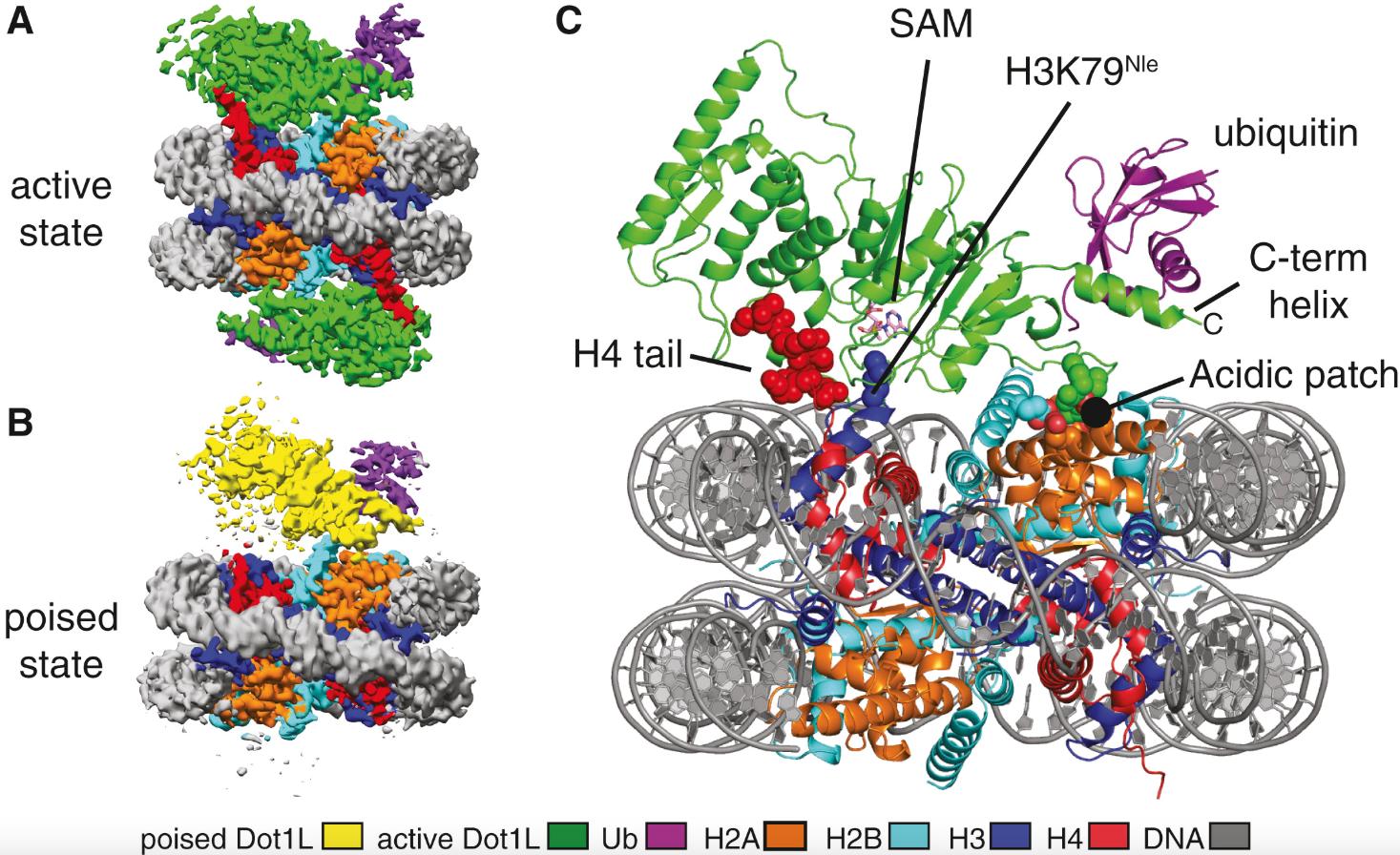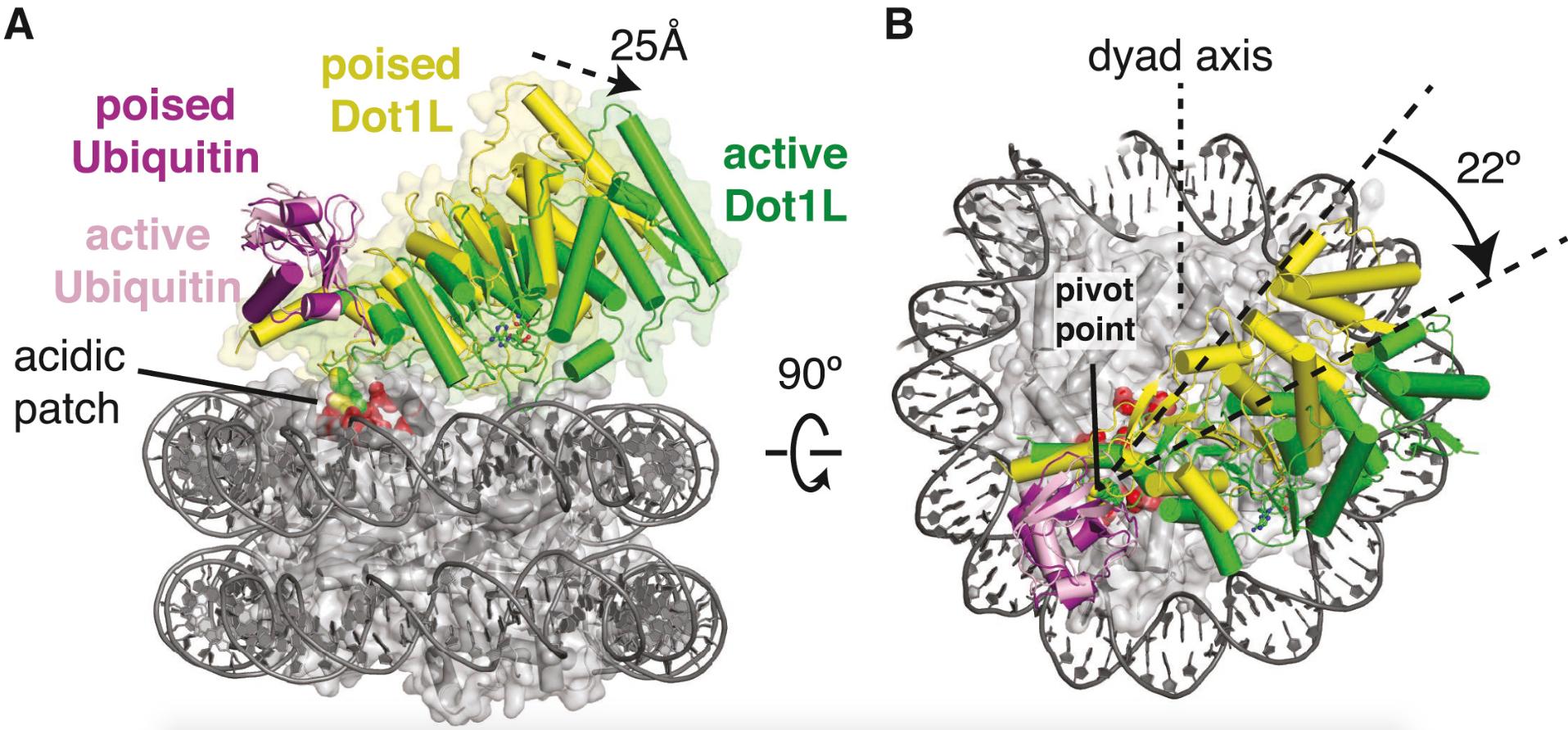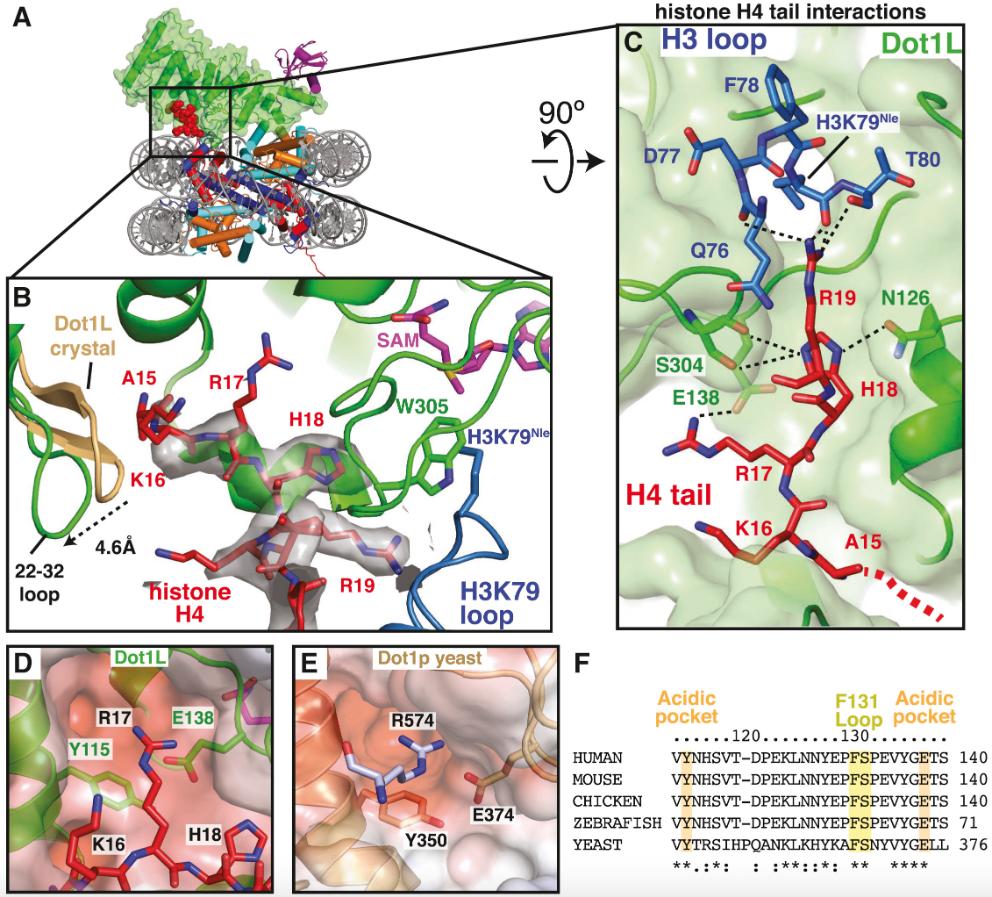 Zhou, Evidence that ubiquitylated H2B corrals hDot1L on the nucleosomal surface to induce H3K79 methylation. 2016, Pubmed
